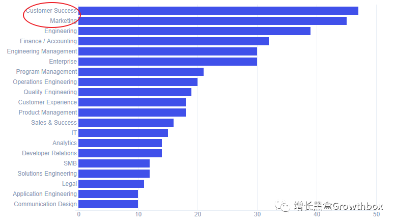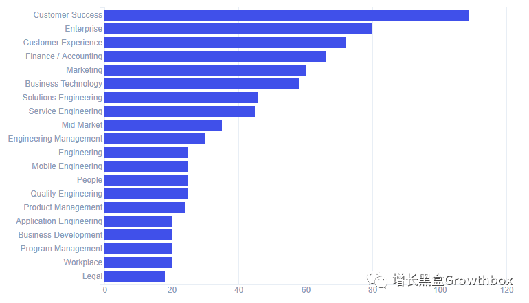 但自2017年2月起,Customer Success客户成功团队和Marketing市场营销人员的招聘数量大幅增加,对这两类人员的需求占据所有岗位的前两位,远超对软件工程师的需求。