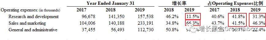 在2018到2019财年间,Slack的研发支出增长了11.5%,而营销支出则增长了66.5%。在2018财年时,研发和营销在总体Operating Expenses中的比例还是平分秋色,但到2019财年,营销支出的占比已经达到了46%左右。这样看来,营销已经成为其主要的着力方向。