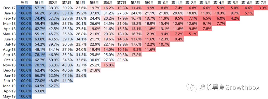 根据活跃大客户的月度数据,我们可以通过同期群分析观察到活跃大客户的留存情况。同期群分析展示了不同月份进入的活跃大客户在之后的n个月里的留存情况。需要说明的是,这里的数据仅仅是从流量角度监测到的排名靠前的活跃大客户,很多客户流量没有达到可监测的体量便没有被记录在内;或者之前月份活跃的客户在某月流量没有达到可监测的门槛,也没有被记录到。所以这里的留存数据并不是传统意义上的留存,属于活跃用户的留存情况。