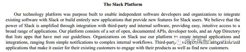Slack产品引以为傲的功能便是可以集成众多第三方应用,比如Github,Google Drive等,以及可以根据Slack公布的API自行开发自己的集成应用。这项功能在招股书中被形容为The Slack Platform,可见其想成为一站式办公平台的野心。