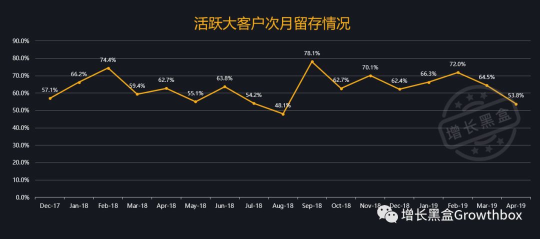 就Slack活跃客户的次月留存来看,其留存率一直处于波动变化中,整体发展趋势平稳发展。
