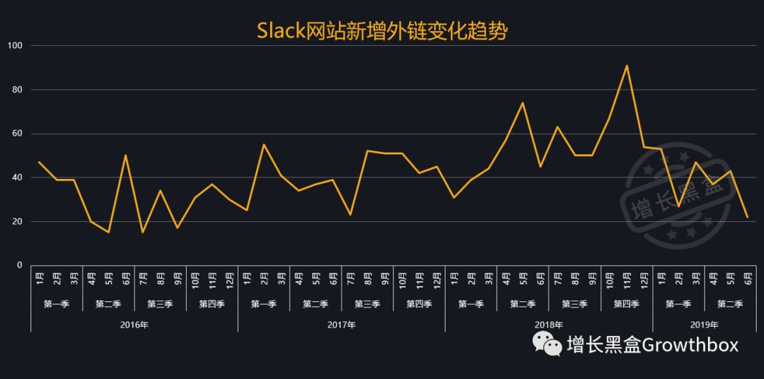 通过绘制众多外链首次被观察到的时间曲线,可以发现,Slack每月接入新应用的数量长期看来一路走高,在2018年第4季度达到顶峰,但进入2019年后便开始下降。