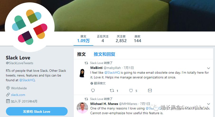 对此,Slack在Twitter为用户提供了一个表达对Slack热爱的地方。最初是主账号@SlackHQ建立了两个“爱心墙”板块,专门用来转载用户对于Slack的好评(2015年起停运)。自2015年后,又单独开辟了@SlackLoveTweets这个账号,把好评功能转移至此。部分资料显示,自Slack成立开始,这就成为其种子用户增长的重要渠道。