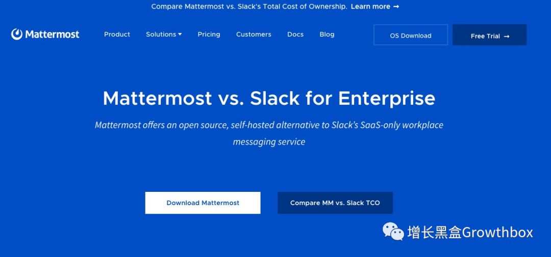 而另一个竞品Mattermost更是大胆地把自己和Slack的对比放到了首页,突出自己支持开源、私有化部署、成本低等特点。