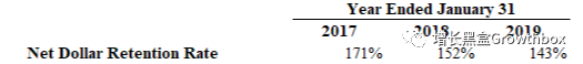而Slack的“净收入留存率”(Net Dollar Retention Rate)一直处于100%以上,在过去的三年分别为171%,152%,143%。Net Dollar Retention Rate在Slack的招股书中被多次提到,它反映的是老客户忠诚度和持续付费能力。一般来说,如果处于100%以上,便是发展不错的迹象,而低于75%就急需反思经营状况哪里出现问题了。
