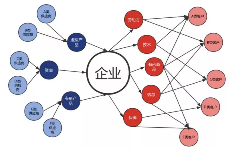 企业作为这个交换网络的中心,和不同的主体在做各种不同生产要素的交换,企业将外界获取的生产要素,在自己体内进行加工,然后生成新的生产要素对外输出,换取回报。