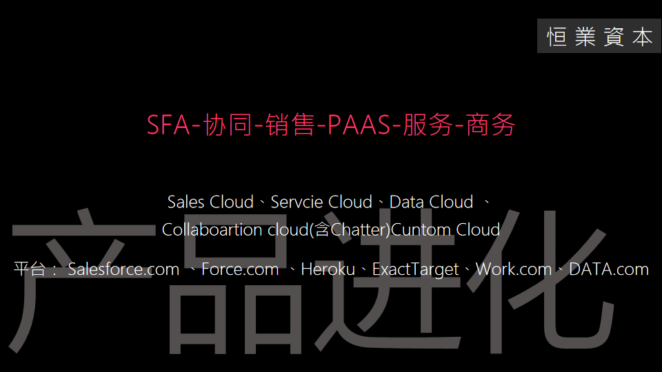 平台: Salesforce.com 、Force.com 、Heroku、ExactTarget、Work.com、DATA.com,SFA-协同-销售-PAAS-服务-商务