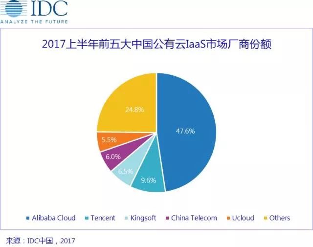 IDC未公布2017年下半年的报告数据,仅公布了2017年上半年的数据,前五大 IaaS 供应商:阿里云、腾讯云、中国电信、金山云、UCloud。