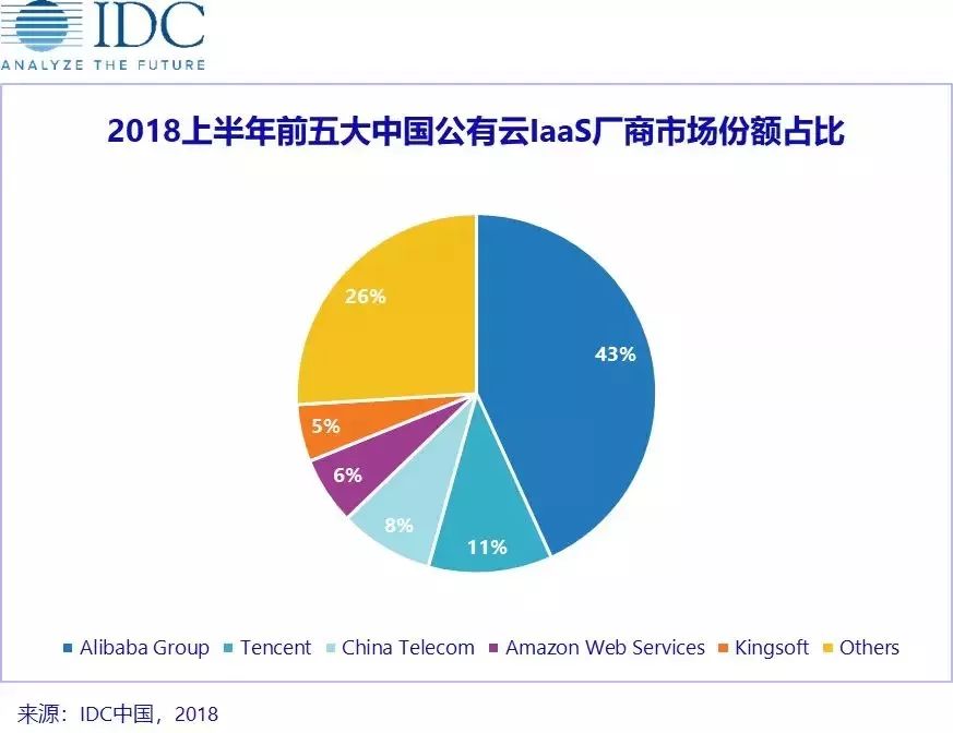 2018年11月26日IDC发布《《中国公有云服务市场(2018上半年)跟踪》报告显示,而前五大IaaS厂商同样是阿里云、腾讯云、中国电信、由光环新网和西云数据运营的AWS、金山云。