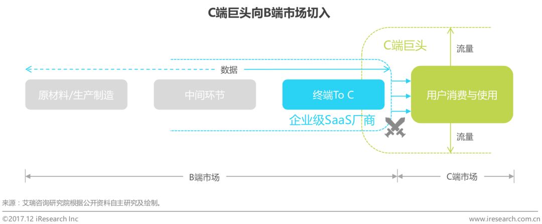 C端的巨头企业向B端市场切入,这一类的SaaS典型代表就是钉钉、企业微信,基于C端用户的巨大流量优势,向B端的企业级SaaS切入。