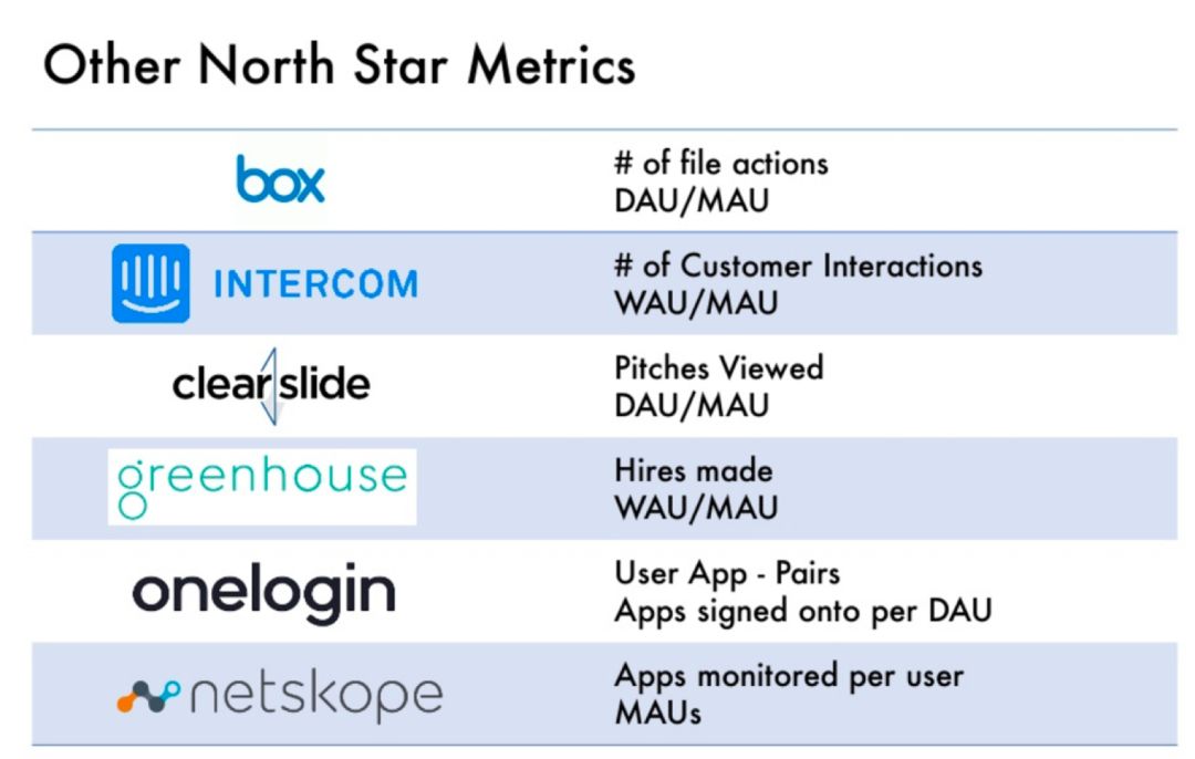 北极星是一“司”一议的指标:每个公司都要找到能衡量产品创造的持久真实价值的运营指标,这个指标一般不会是MRR那样的财务指标,也不是MAU,DAU那样的表层运营指标,而是真正体现产品价值的内核指标。例如对于企业IM产品来说,可以定义单天发送/接受信息超过10条,并且登陆时长超过一天6小时的用户数/总注册用户数,作为核心指标。例如下图Social Capital投资的一些SaaS公司所定义的北极星指标: