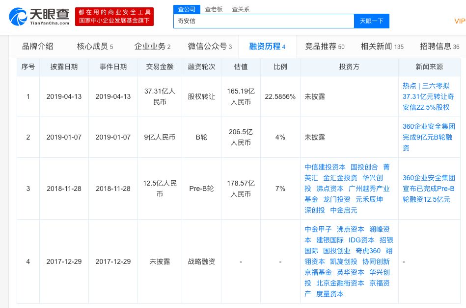 ToB行业头条(微信ID:wwwqifu)也从天眼查了解到:2017年底至今,奇安信累计获得多笔融资。其中包括12.5亿元Pre-B轮融资和9亿元B轮融资。