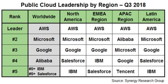 从上图可以看出,在全球主要四大区域的三个区域中,都是AWS、微软和谷歌排名前三。只有亚太区是个例外,阿里云排名第二,腾讯云排名第五。