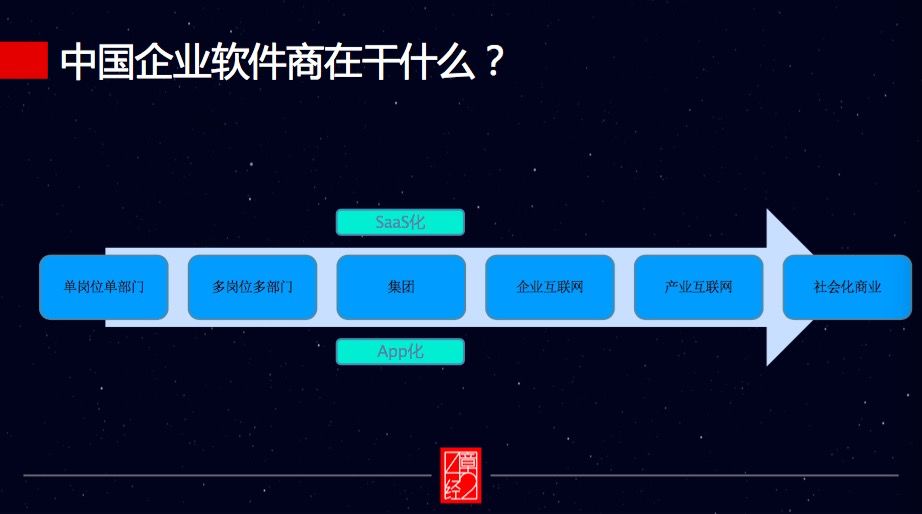 答案是,社会商业化。也就是到最后,企业软件商可以和公共基础设施(譬如政府、海关、税务、工商、社保等)联动在一起。这是未来,而我只看了凤毛麟角的厂商,在往这个方向发展。