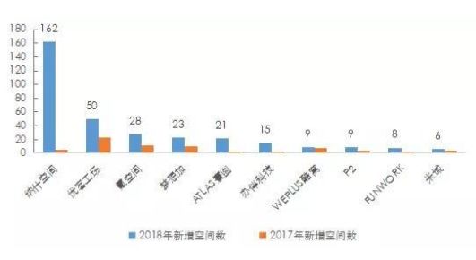 2017-2018年克而瑞监测的头部10家联合办公企业新增空间数量(单位:家)