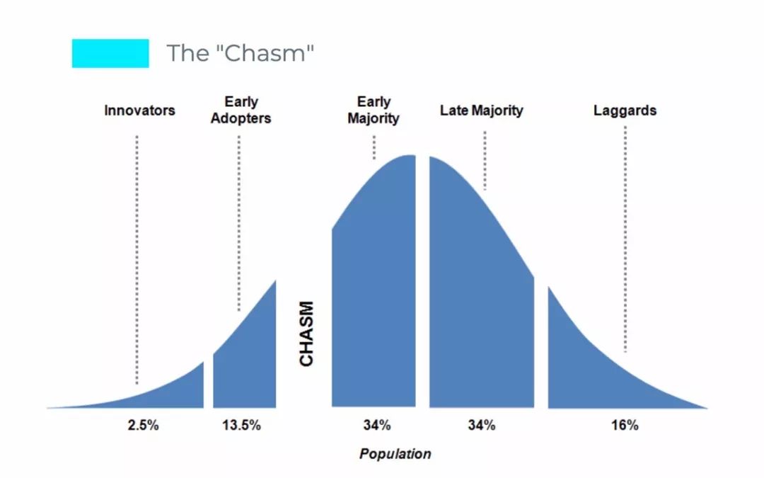 早在1991年Jeffery Moore针对高科技行业和高科技企业生命周期的特点,提出了著名的“鸿沟理论”。这个理论基于“创新传播学”,将创新性技术和产品的生命周期分为五个阶段:创新者(Innovator)、早期使用者(Early adopters)、早期大众(Early majority)、晚期大众(Late majority)、落后者(Laggard)。