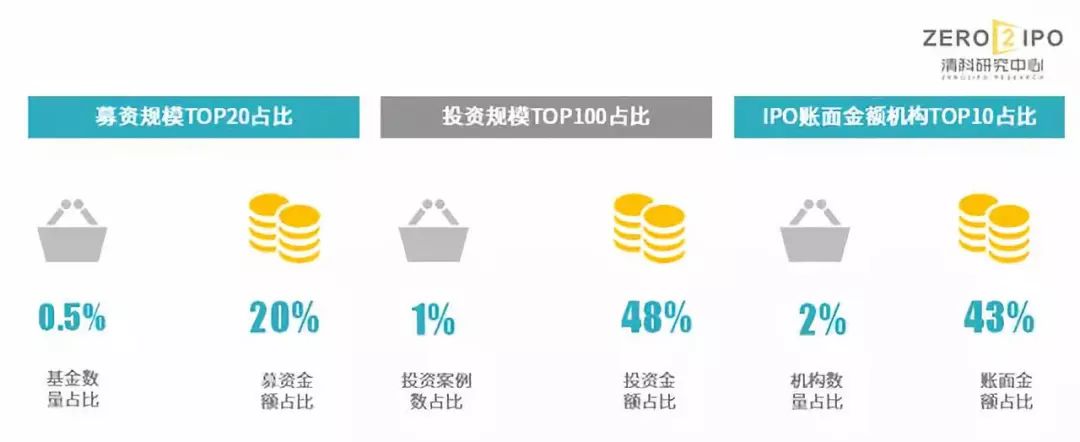 资金的高度集中在基金退出环节也有所体现。根据清科研究中心统计,2018年中国股权投资市场被投企业IPO账面总金额[4]TOP10的机构,即2%的机构所投企业IPO账面总金额占整个股权投资市场IPO账面退出总量的43%。