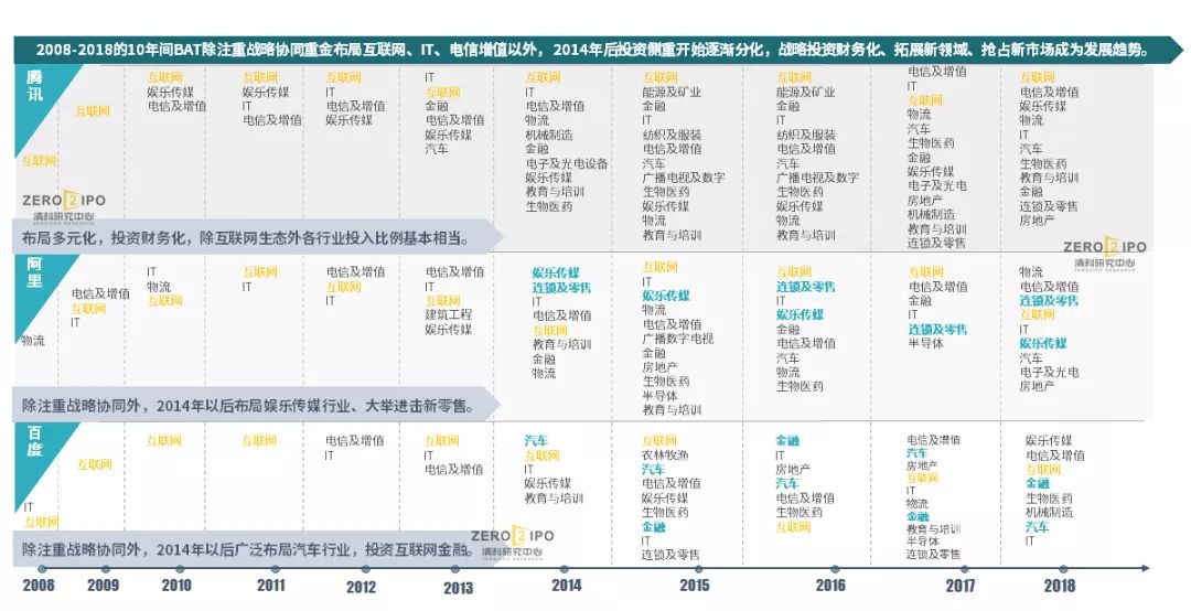 纵观近十年以BAT为代表的互联网巨头的战投之路,除注重战略协同重金布局互联网、IT、电信增值业务以外,2014年之后投资侧重逐渐开始分化,战略投资财务化、拓展新领域、抢占新市场成为发展趋势。