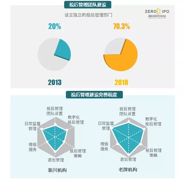 越来越多的机构意识到投后管理的重要性:根据清科研究中心不完全统计,2013年的调研机构中,仅有16.1%的机构设置了专门的投后管理团队,而2018年该数据已达70.3%,越来越多的机构意识到投后管理的重要性。