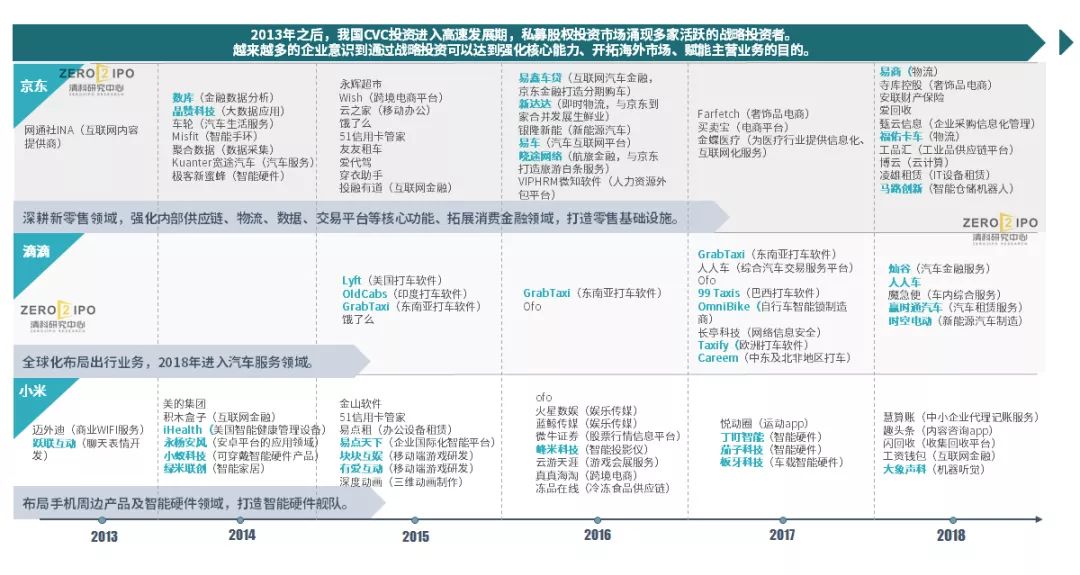 除BAT等互联网巨头外,以京东、滴滴、小米等企业为代表的“后起之秀”,以及五八、好未来等新兴创业企业,均加速布局一级市场,实施战略投资,以达到强化自身核心能力、开拓海外市场、赋能主营业务的目的。
