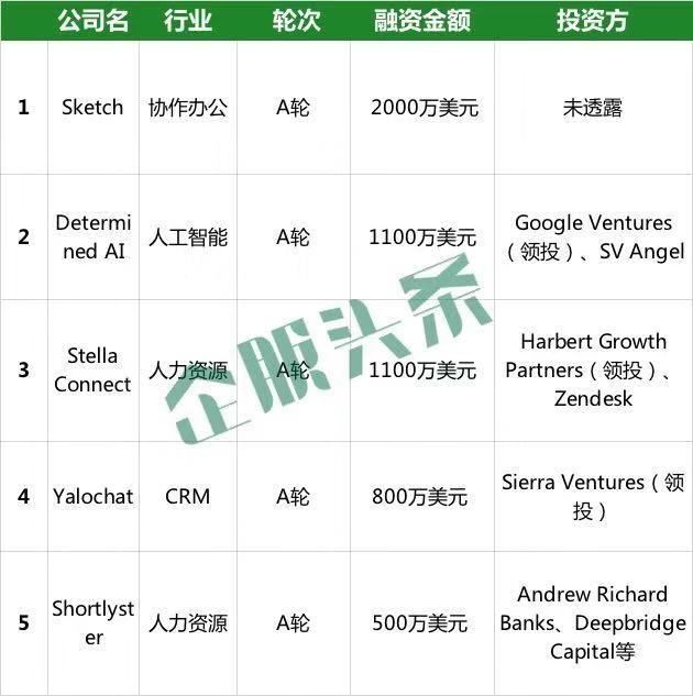 本周共收录国外企服领域5起融资,主要集中在4个领域,分别为协作办公、人工智能、人力资源和CRM领域。
