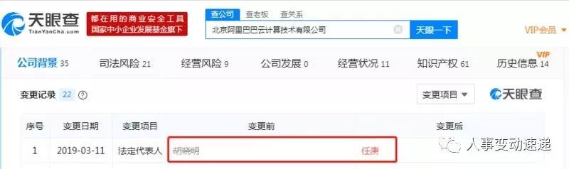 天眼查数据显示,3月11日,北京阿里巴巴云计算技术有限公司法定代表人发生变更,胡晓明卸任法定代表人,任庚接任。