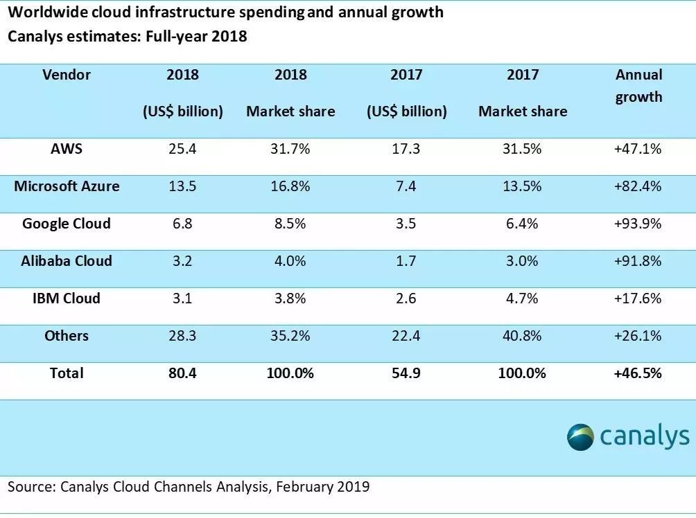 据调研机构 Canalys 数据,2018 年,全球云计算市场规模已经突破 800 亿美元,同比大幅增长 46.5%;而这个数字在 2020 年有望超过 1550 亿美元。但为了支撑全球各地搭建数据中心的新建和运转,云服务提供商每年付出的成本也高达 100 亿美元。鉴于这样持续、庞大的资金技术注入,能够觊觎这块蛋糕的,只有为数不多的头部玩家。