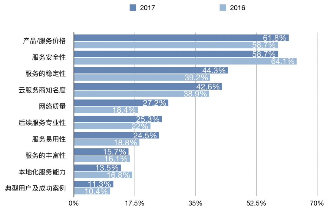 结合以上数据,可知国内企业上云最先考虑的还是成本和稳定性。这也是解释了各厂商为何以降价的方式抢占市场。2017 年,阿里云连续降价 6 次,堪称中小玩家的噩梦。而对于已上云的企业,它们把管理系统和核心业务系统往云端迁移的比例在逐步增加;而没上云的企业里,有 30% 会在未来三年内采用云服务。