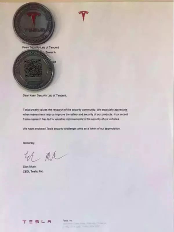 为了表彰科恩实验室的贡献,吴石的团队获得了特斯拉官方在2016年12月公开致谢以及4万美金奖励,并成为年度唯一一支获得“特斯拉安全研究员名人堂”的团队,这一消息甚至惊动了马斯克,它们收到了硅谷“钢铁侠”的亲笔致谢信。