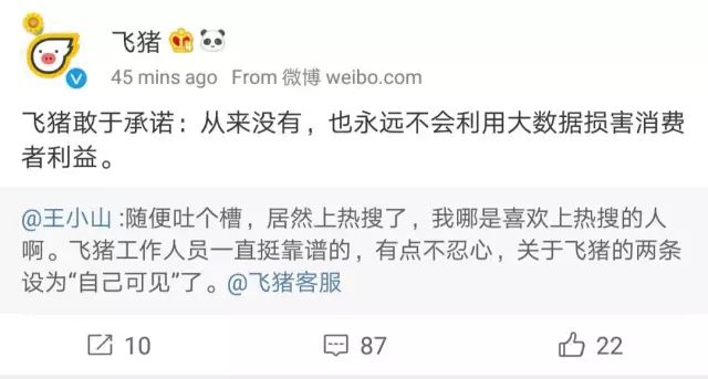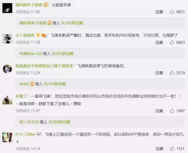 而飞猪则回应称,“飞猪敢于承诺:从来没有,也永远不会利用大数据损害消费者利益。”