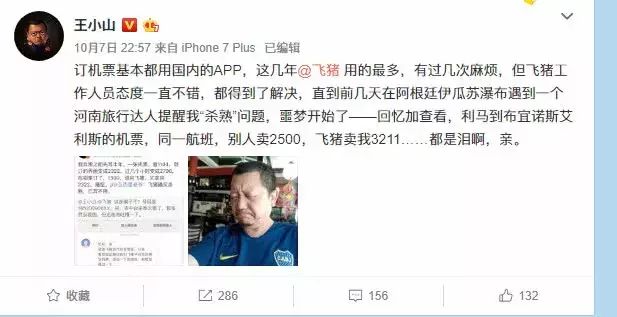 去年,微博大V王小山称在飞猪上“同一航班,别人卖 2500 元,飞猪卖我 3211 元。”。
