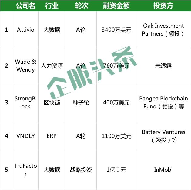 本周共收录国外企服领域5起融资,主要集中在4个领域,分别为大数据、区块链、ERP和人力资源。