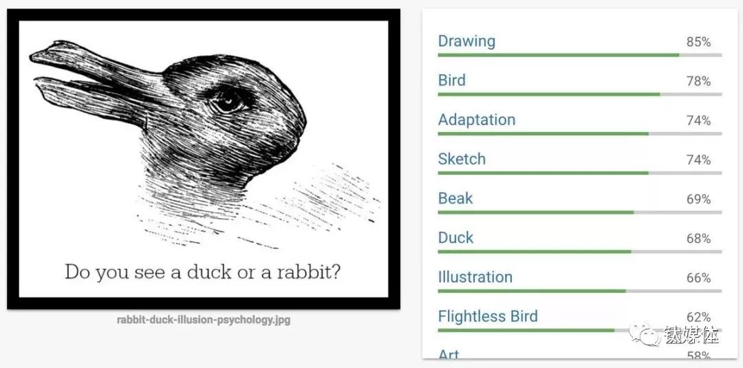 上周四,有位学者决定让没有心理活动的第三方看一下。然后就把这张图片给了谷歌AI,结果AI认为78%的概率是一只鸟,68%的概率是一只鸭子。