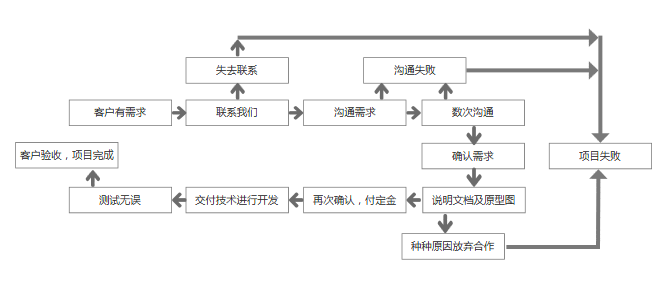 当然,这是一个成功的项目流程,这其中也会出现各种因种种原因造成的项目夭折的情况,故为了更好地理解,也可以参照如下的业务流程图。