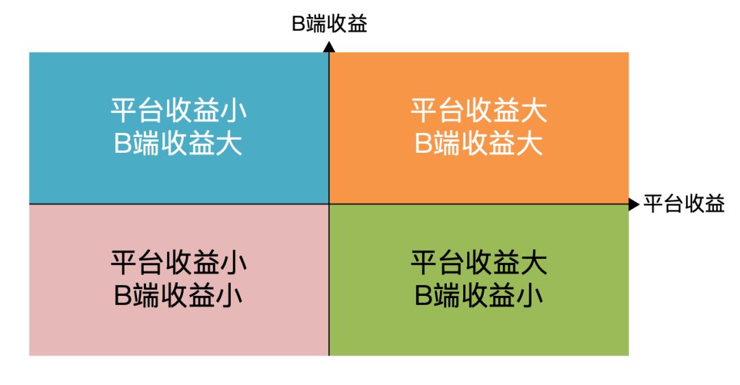这里我讲一种分类方法,从平台收益和B端收益两个方面进行评估,通过四象限法则,对B端和平台间的关系亲疏做出判断,平台从中选择与自己最匹配,最合适的B端。