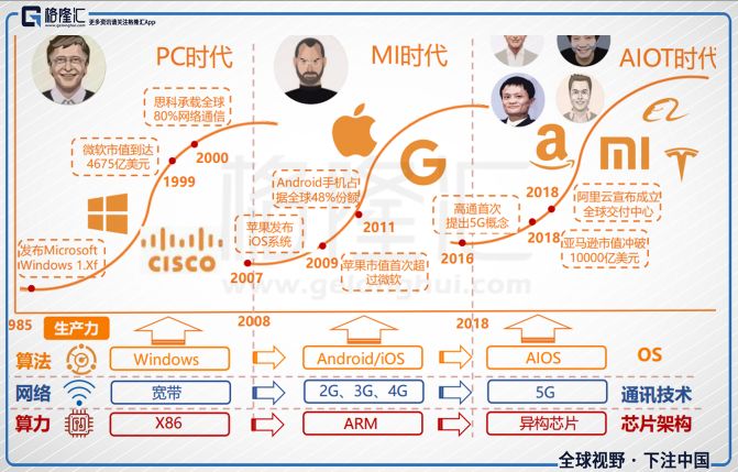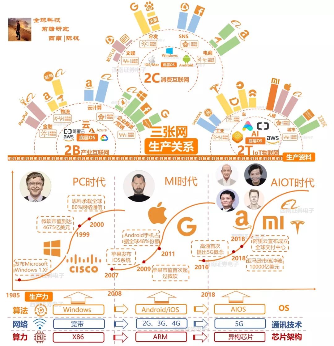 生产力决定生产关系,以算法+算力+网络为代表的基础设施就是生产力,其更新与迭代决定着网络效应的支配强度。我们立足于技术演化的时代角度,用操作系统承载算法,用芯片表达算力,用通讯技术实现网络互联,将科技周期分为三个大时代:PC时代,MI时代以及IoT时代。正是由于基础设施与三张网的交叉互联,形成了我们所处的互联网时代。万物皆周期,我们御风踏浪。
