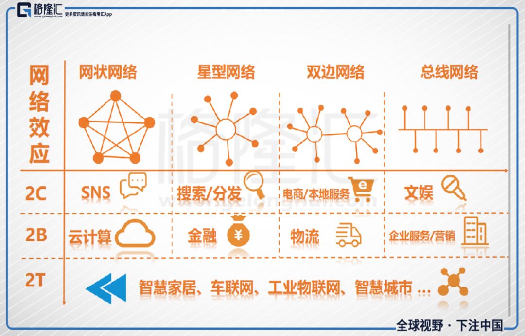我们按照拓补结构,将网络效应分为总线网络、双边网络、星形网络和网状网络。