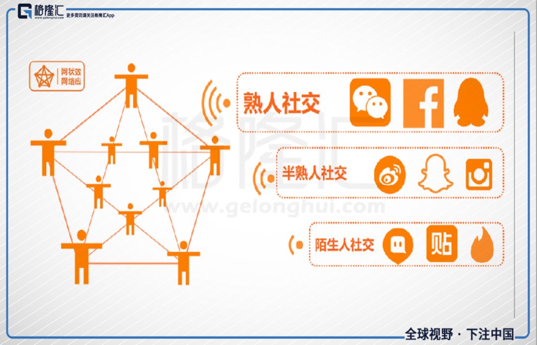 SNS社交网络就是典型的网状网络拓扑结构,具备极强的网络效应和天然封锁赛道的能力。其中熟人社交是网络效应最强、最容易产生巨头的社交网络模式,由于人与人之间的强联系性,使得熟人社交在网络上具备极强的自我集聚效应和极高的平台转换成本,产生了具有代表性的巨头Facebook和腾讯旗下的微信和QQ等。