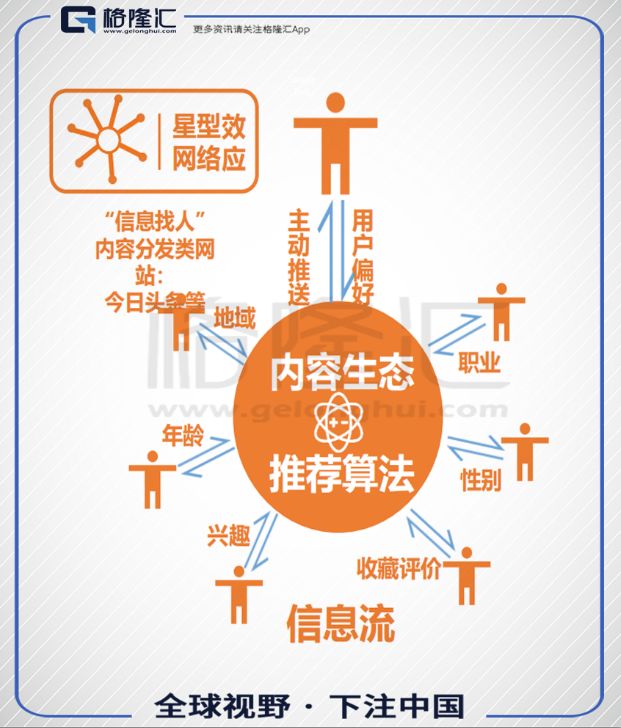 搜索:是人找信息,参与信息搜索的人越多,信息输出结果更优化,是典型的星型网络结构。