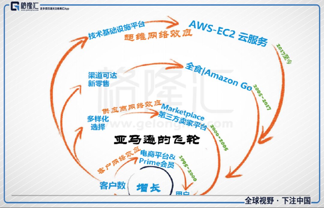 根据亚马逊的飞轮模型,底层飞轮在完成客户原始积累、形成强大的供应商网络效应。