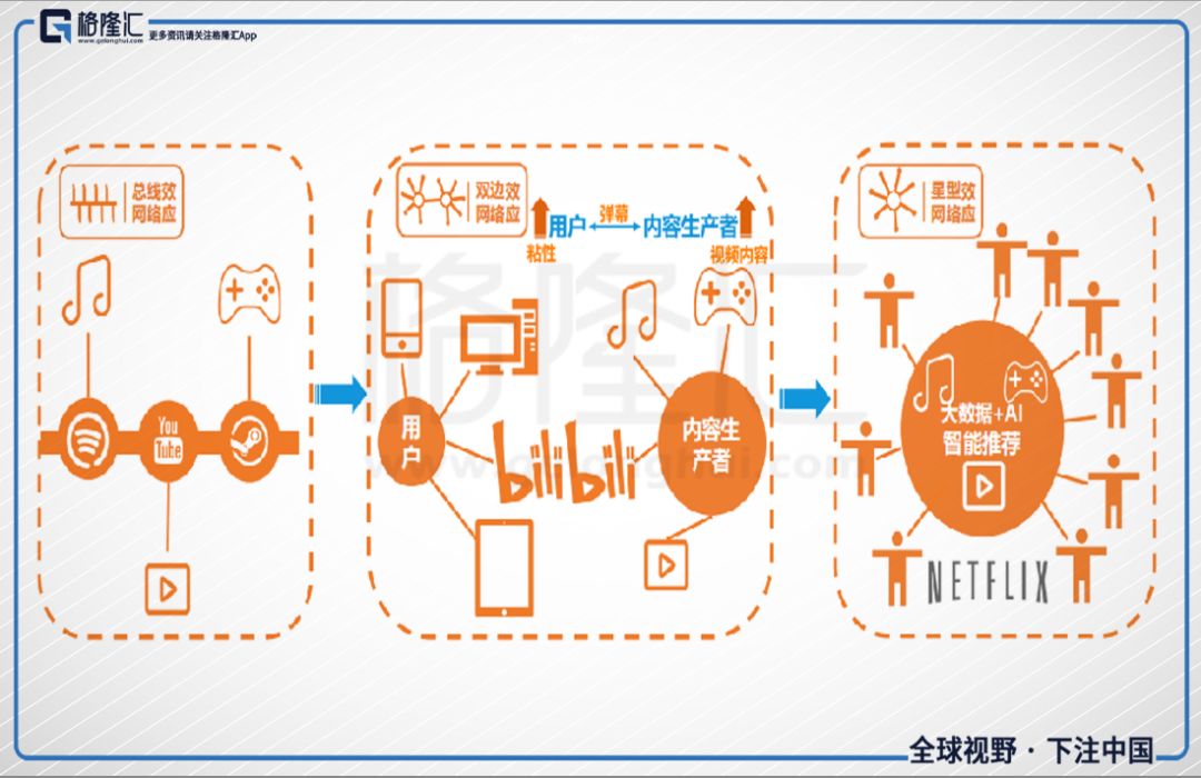 2、双边网络效应:BiliBili的内容生产者通过用户的弹幕反馈完善自身的内容生产逻辑并产生差异化特征,用户则从内容粘性转变为对内容生产者的粘性,但其对于内容的供给模式依旧依靠内容生产者而非后台数据分析后智能分发。