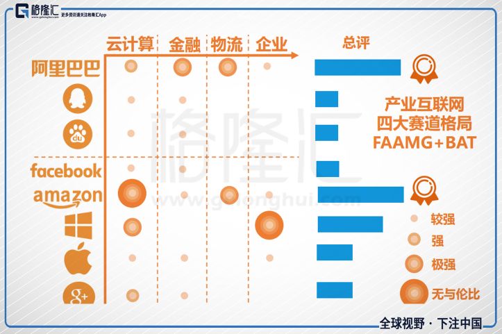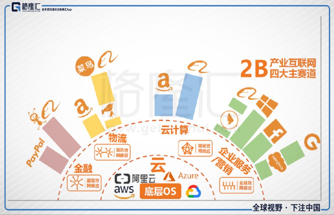 ToB的产业互联网:2B的数字化是基于企业的需求,解决的是效率提升,最终实现帕累托有效,我们同样抽象出云、金服、物流、企业服务四条B端主赛道,在网络效应主导下格局已定,阿里、亚马逊、微软领跑全球。
