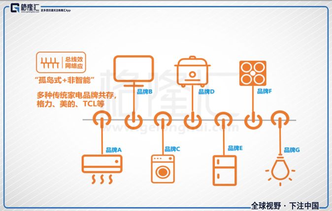 1)传统方式:总线型网络效应。在这种模式下,家庭应用终端是非智能化的,各个节点之间是孤岛式的、互不连接的,且不同终端通常采用不同品牌,网络效应极弱。