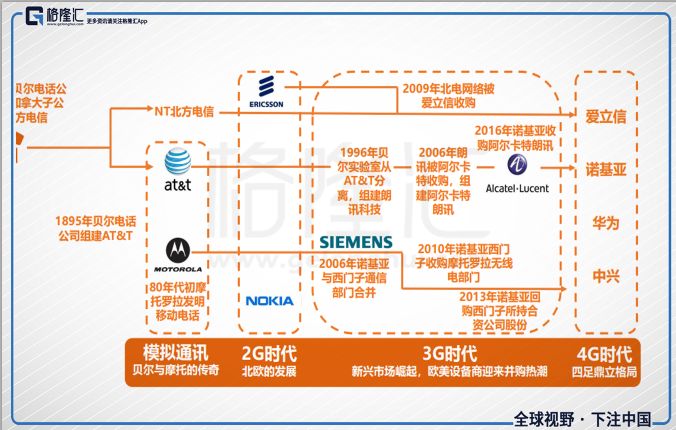 3G/4G,开启移动通信新纪元。在经历了1G“大哥大”横行和2G诺基亚崛起时代之后, 3G以更快的网速开启了行动通讯的新纪元。4G集3G与WLAN于一体,能够传输高质量视频图像。在3G、4G时代,华为、中兴与爱立信、新诺基亚四足鼎立。