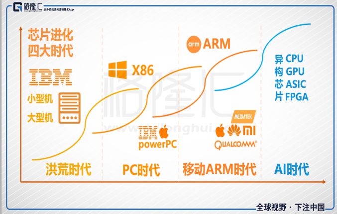 芯片作为算力的承载力,它的发展经历了四个阶段,从IBM大/小型机的逻辑处理架构为代表的洪荒时代开始,经历了以X86和PowerPC为代表架构的个人电脑时代和基于精简指令集的ARM架构引领的移动设备时代,来到了目前以专用协处理器,异构芯片为核心的AI时代。