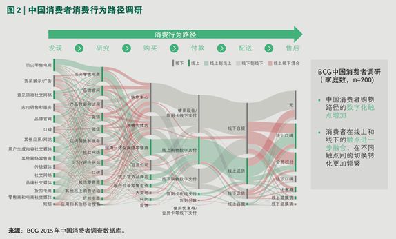 1)沿着消费行为为路径,中国消费者从发现、研究,到购买、付款、配送,再到售后的每个环节已形成线上和线下多渠道、多触点全面融合的现象;
