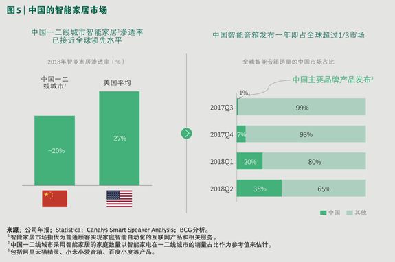 以智能音箱产品为例,在 2017 年第三季度,中国销量仅占全球市场的 1%。而在一年后的 2018 第二季度末,中国销量已经占全球市场的三分之一。