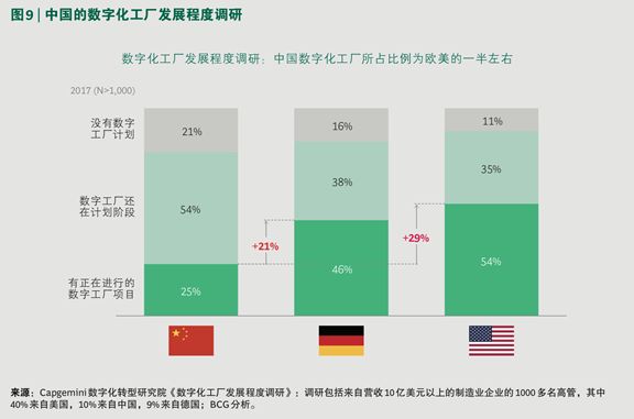 根据 Capgemini 针对全球 1000 个制造业企业的调研显示,截至 2017 年 3 月,中国现有数字化工厂所占比例为 25%,仅为美国与德国的一半左右,其差距体现在智能互联、信息整合、数据决策以及人机协作四个核心方面。