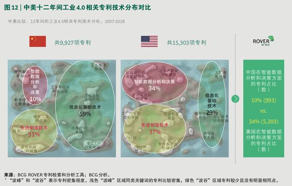 根据 BCG 专 利分析工具 ROVER® 的分析:在中国,与智能数据分析以及决策相关技术的专利占比仅有 10%,对应的专利数为 993;而这一比例在美国为 34%,对应的专利数为 5,203。