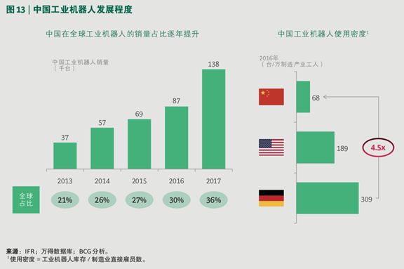 4)人机协作:中国在与人机协作相关的先进制造技术的普及程度有待提高。虽然中国在全球工业机器人的销量占比逐步攀升,但是中国工业机器人的使用密度仍远远低于发达国家水平。